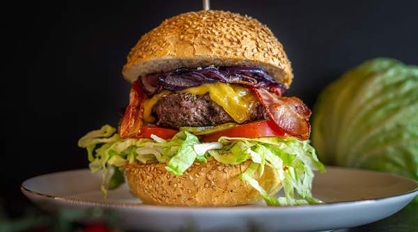 100% wołowiny, rukola, burak czerwony, jajko, bekon, cebula prażona