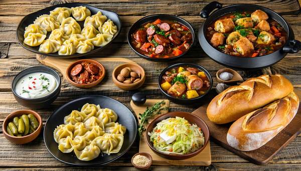 Placek po węgiersku z gulaszem wołowym i zestawem surówek