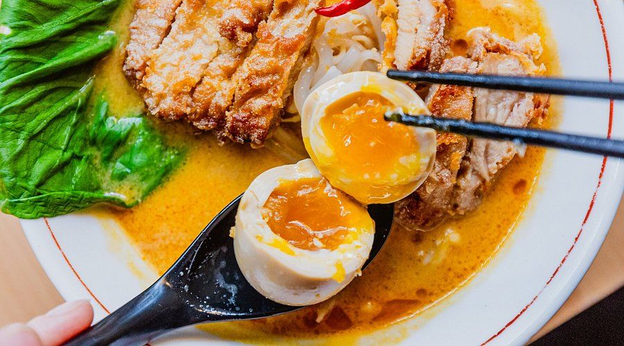 Pikantny ramen na kremowym, kurczakowo-wieprzowym bulionie, tare z pastą orzechową i sezamową, KINKI noodles, pikantna mielona wieprzowina, pak choi, marynowane jajo.