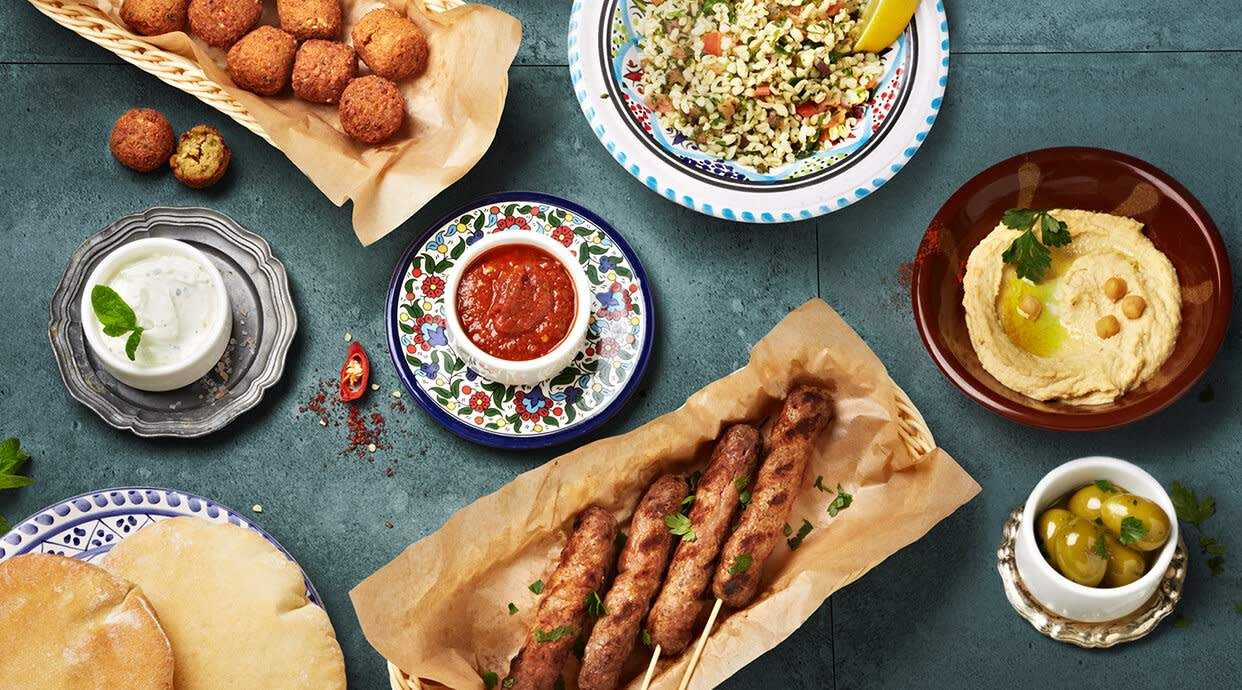 zestaw bliskowschodnich przekąsek: falafele, kofta libańska 100g, harissa, hummus w 3 smakach, oliwki (z pestką), sos jogurtowo-miętowy, paski marchewki i ogórka, sałatka wegetariańska i 2 pity. Porcja 910g