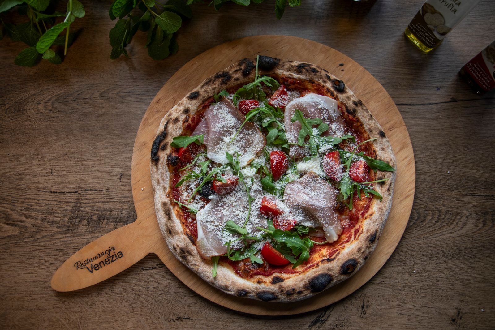 Sos pomidorowy, ser mozzarella, szynka parmenska pomidorki, rukola parmezan