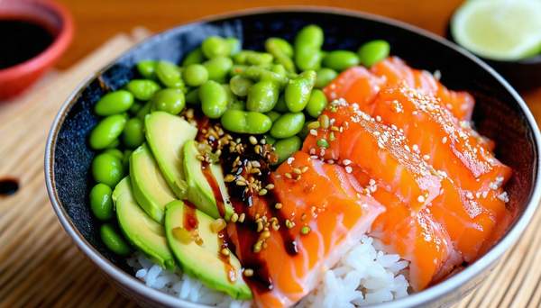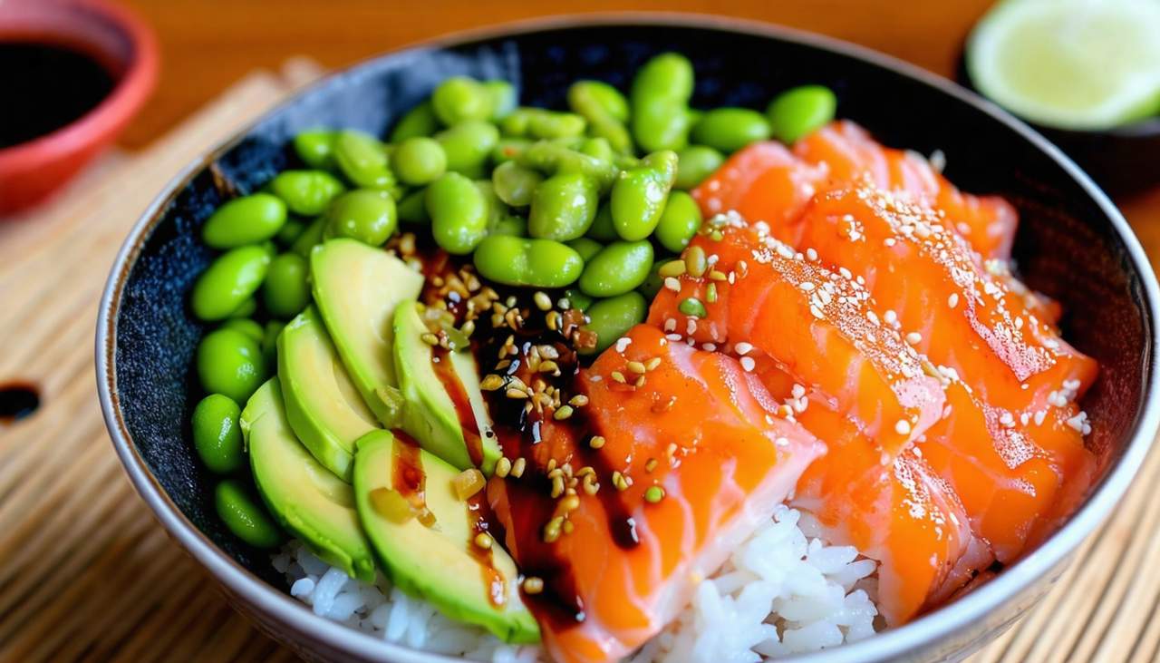 Orientalny makaron noodle w sosie teriyaki z aromatycznym wędzonym tofu, maślanym awokado , plastrami świeżej rzodkiewki, soczystym świeżym ogórkiem, konserwową kukurydzą i marynowanym imbirem.