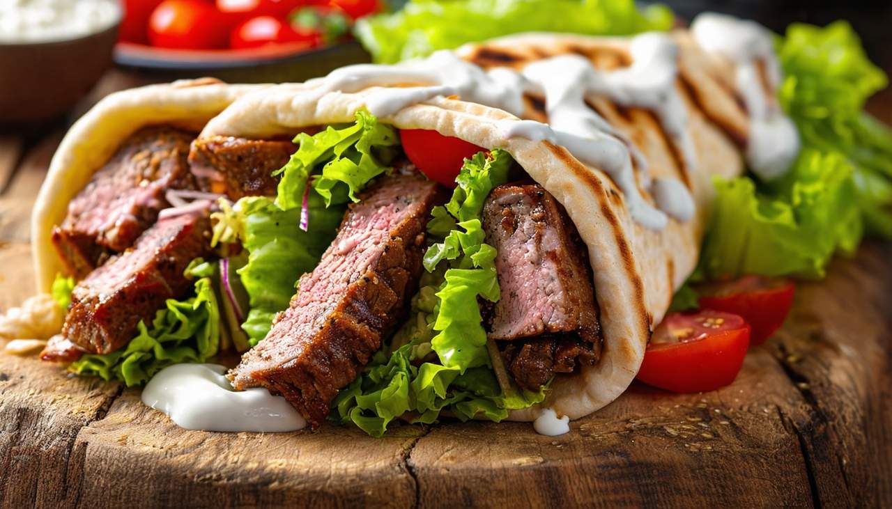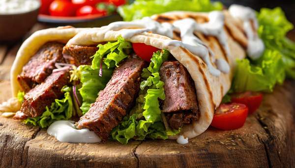 Mięso, cebula, ser żółty, sałatka, sos, pomidor, ogórek, cebula