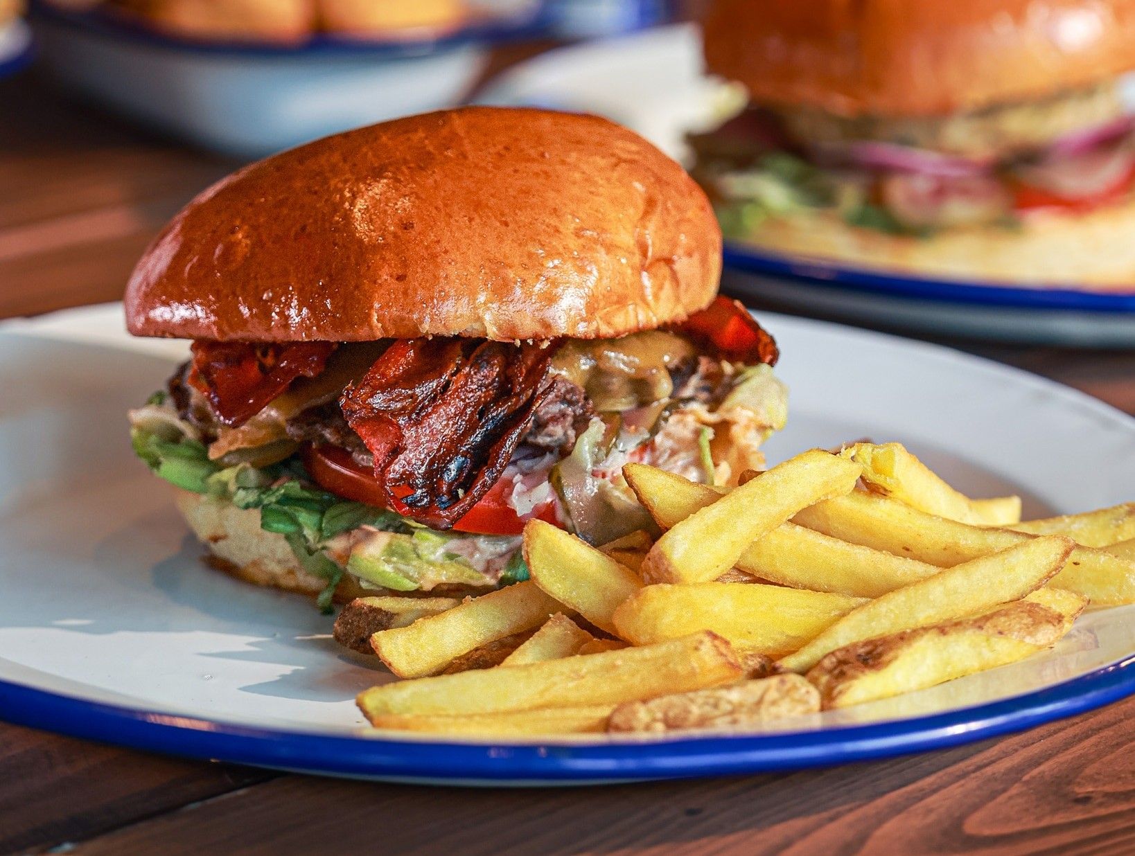 2x wołowina, 2x ser żółty, 2x bekon, ogórek kiszony, pomidor, sałata, sos klasyczny, sos bbq