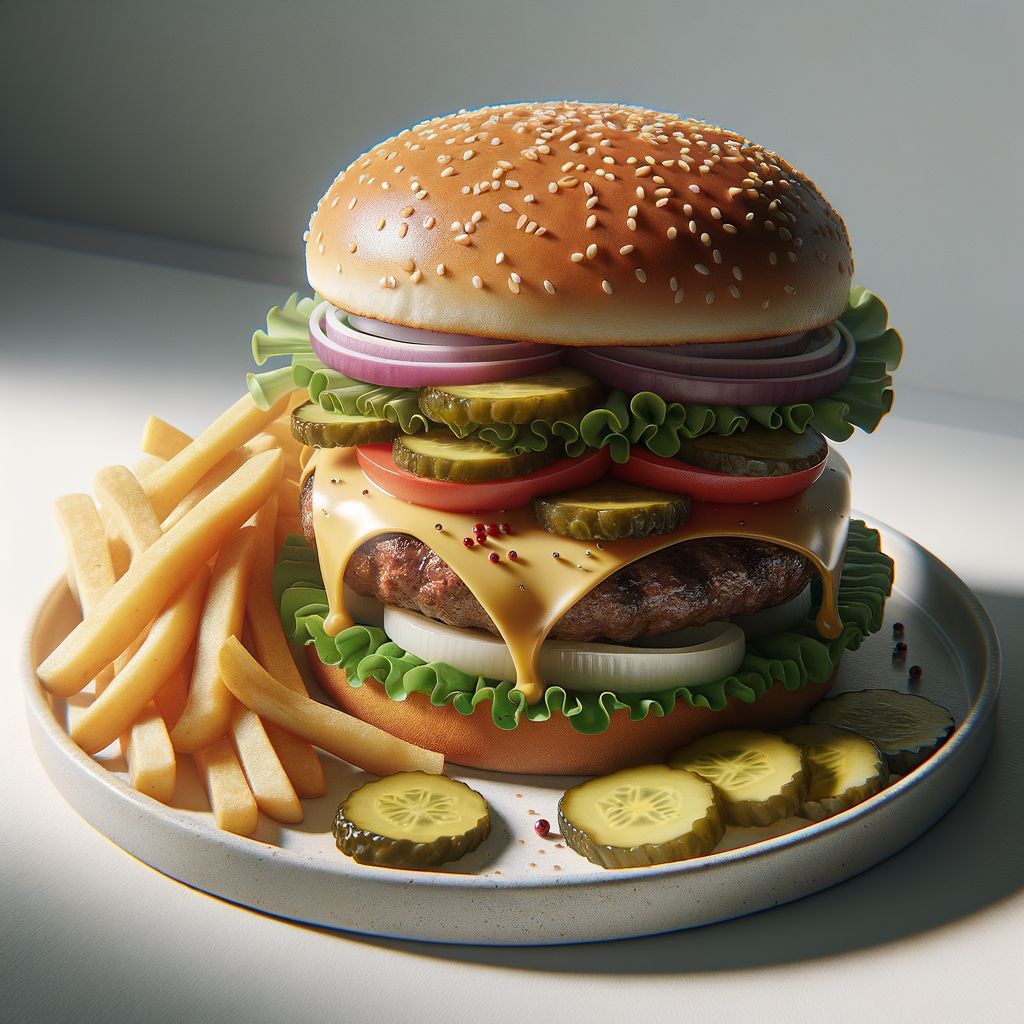 Sos bekonowy, wołowina, ogórek, ser, sałata