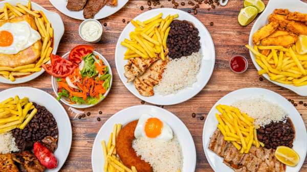 Coxa de frango, salsicha toscana, entrecosto e picanha.Inclui acompanhamento e uma bebida.