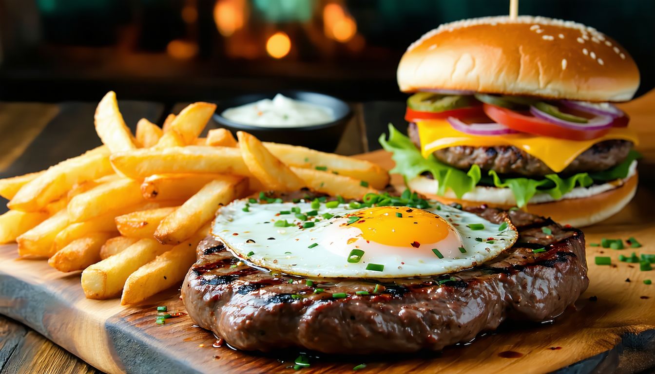 Bife, fiambre, chouriço extra, queijo, ovo estrelado e molho francesinha. Batatas fritas incluídas.