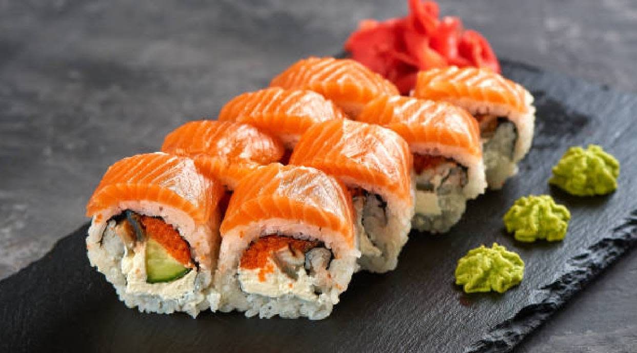 8 Peças de salmão laminado, queijo creme, camarão, ovas de tobiko e wasabi.