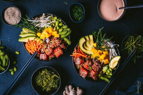 Poke bowl de salmão, bolinha, molho teryaki, arroz, manga, abacate e rúcula. Bowl saudável.