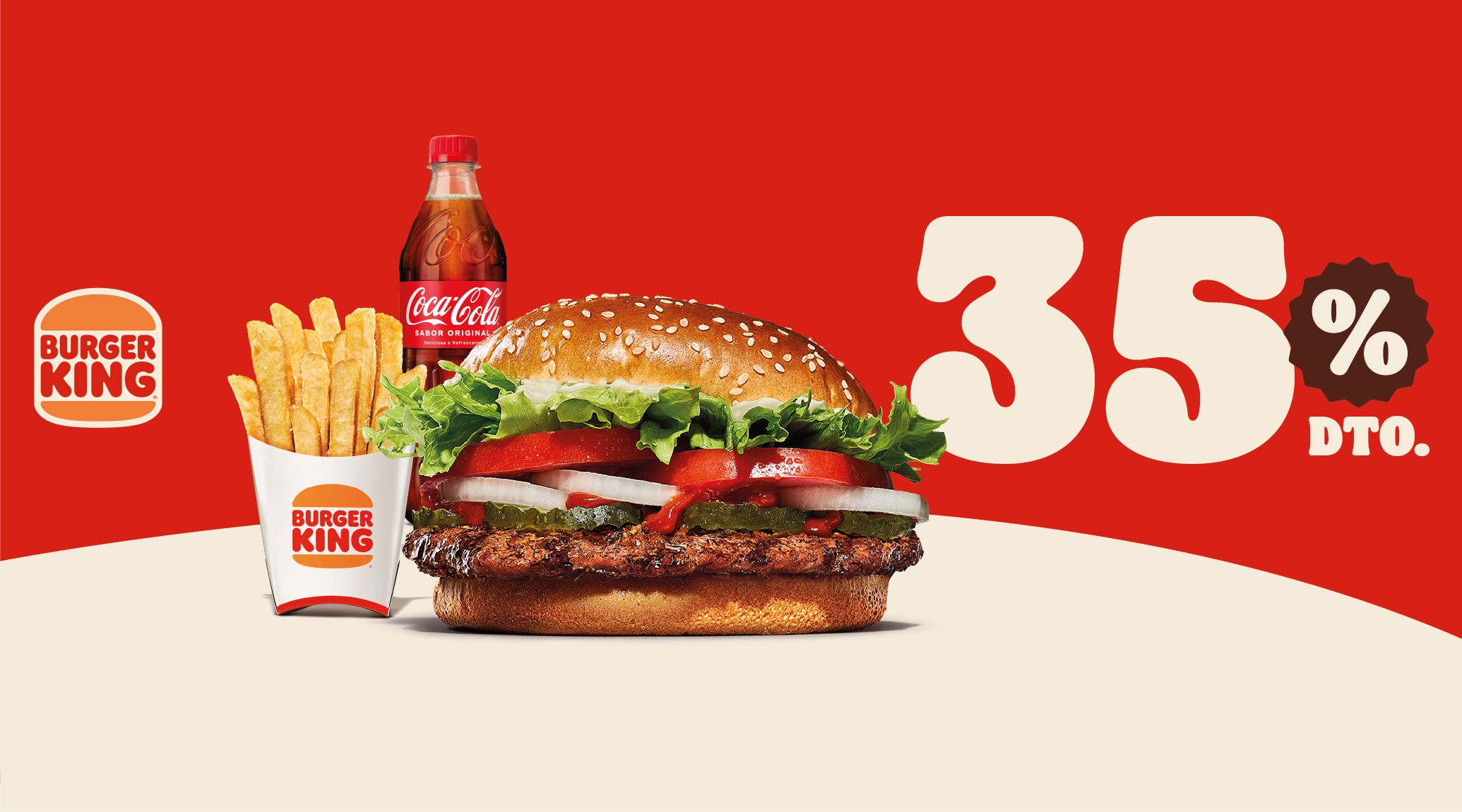 Menu: Vais precisar de uma bebida para apagar este FOOOGO: duas carnes Whopper® grelhadas, bacon, cebola crocante, queijo Flame, molho King Flame e pão brioche com sementes. E claro, as tuas batatas fritas e bebida preferida.