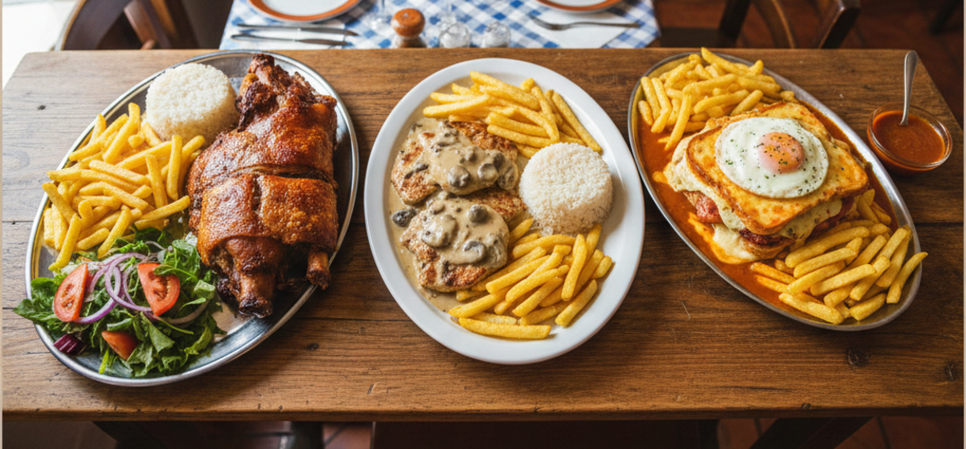 Pão de forma com bife, fiambre e linguiça, coberto com queijo derretido e ovo, regado com molho de francesinha.