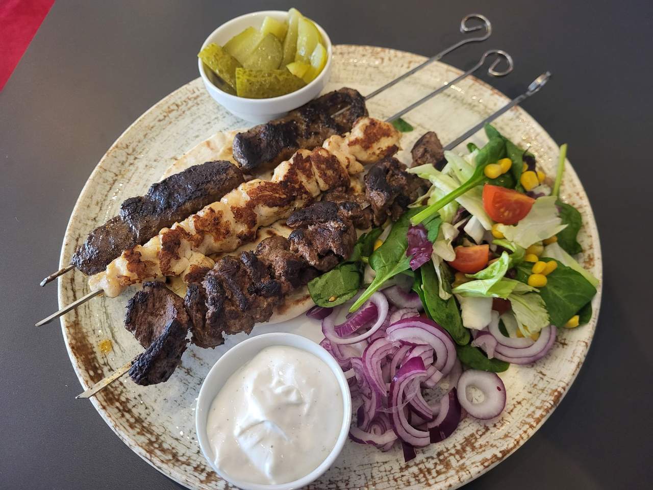 carne de pui marinata 150g, carne de vita marinata 150g, carne tocata de vita&oaie 150g, ceapa, rosii, patrunjel, usturoi, lipie 60g, sos labneh 50g, castraveciori murati 80g