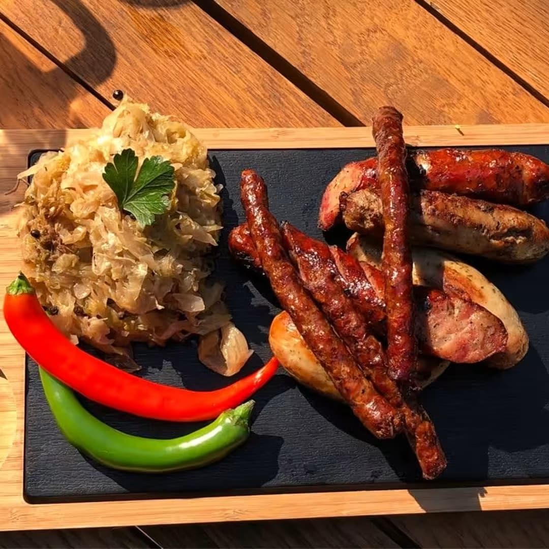 90g/12-g/160g/200g/400g/50g | Cârnați sibieni (90 g), cârnați cu cașcaval (90 g), mici (120 g), piept de pui crispy (160 g). Servit cu murături asortate (200 g) și cartofi prăjiți (400 g) | 188kcal/100g