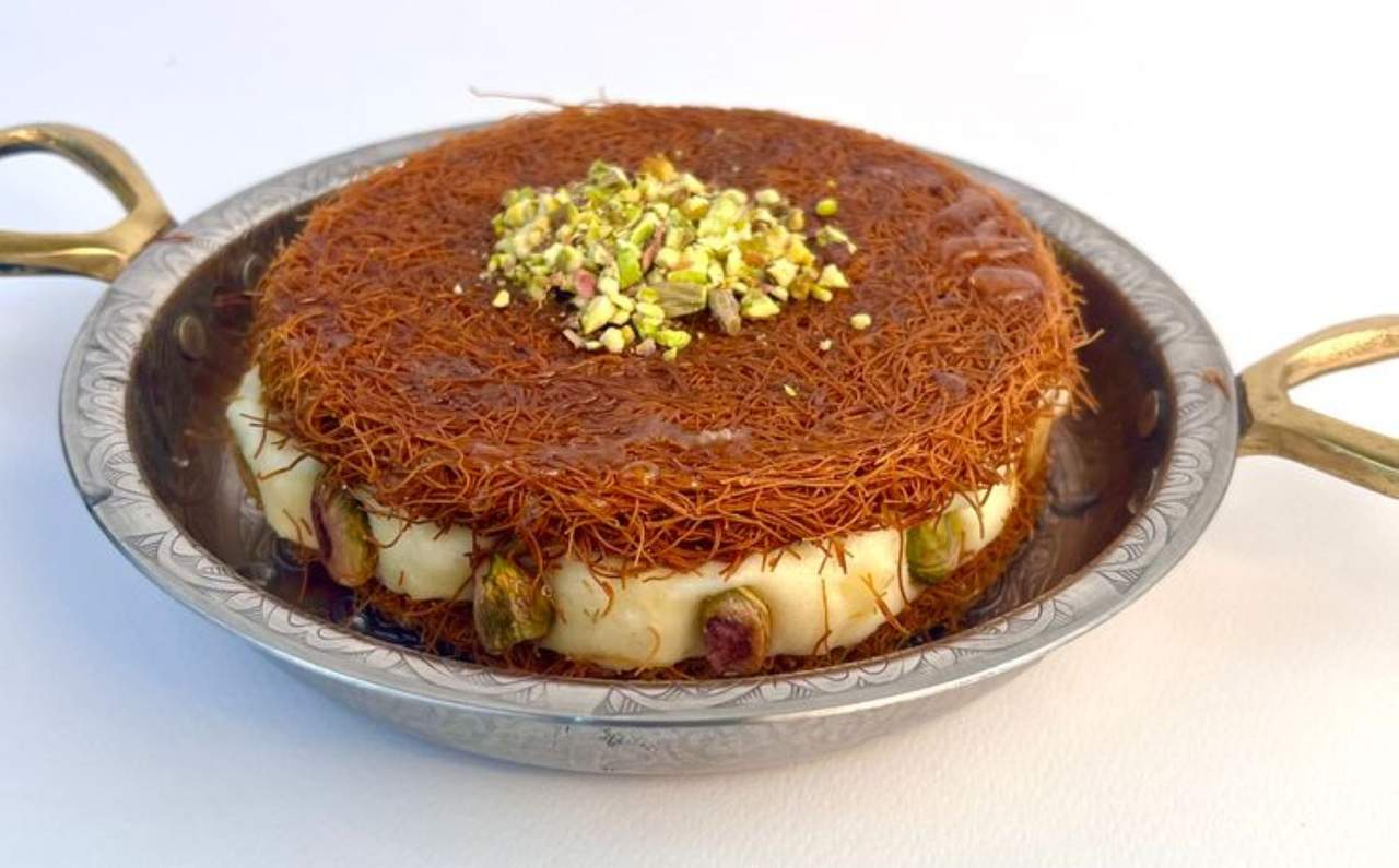 Straturi de mozzarella și tăiței kataif fin tocați, înmuiați în sirop de zahăr și infuzați cu ghee. Finisat cu cremă Kashta fină, pastă de susan și fistic crocant, oferă un gust autentic, bogat, pentru iubitorii de arome orientale - 250g