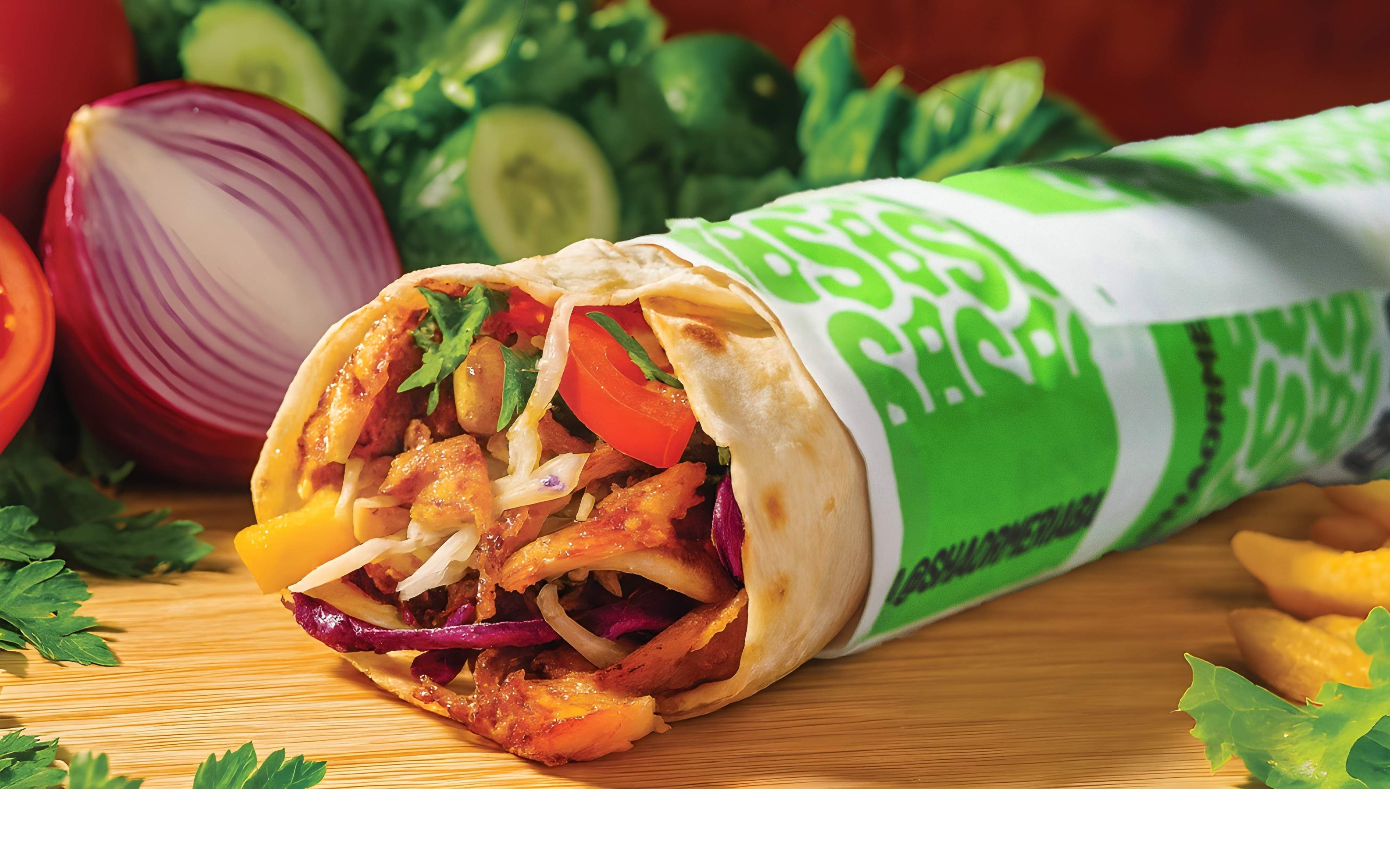 Ingrediente: tortilla (75g), cartofi prajiti (80g), carne vita-curcan-oaie (90g), ardei gras rosu (30g), salata verde (30g), mozzarella (100g), sos usturoi (50gr), sos sweet chilli (25g) Preparatul poate contine ingrediente congelate.