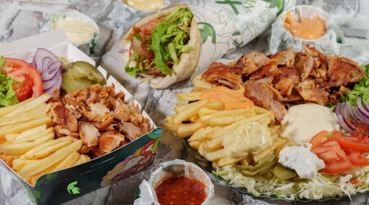 Gramaj 725g din care: Salată de varză 130 g, roșii 15 g, ceapă 10 g, castraveți murați 15 g, salată verde 15 g, cartofi prăjiți 160 g, carne rotisată de amestec 160 g, sos usturoi 40 g, sos dulce-acrișor 20g, sos tzatziki 20 g, sos legume 20 g, pita 120g