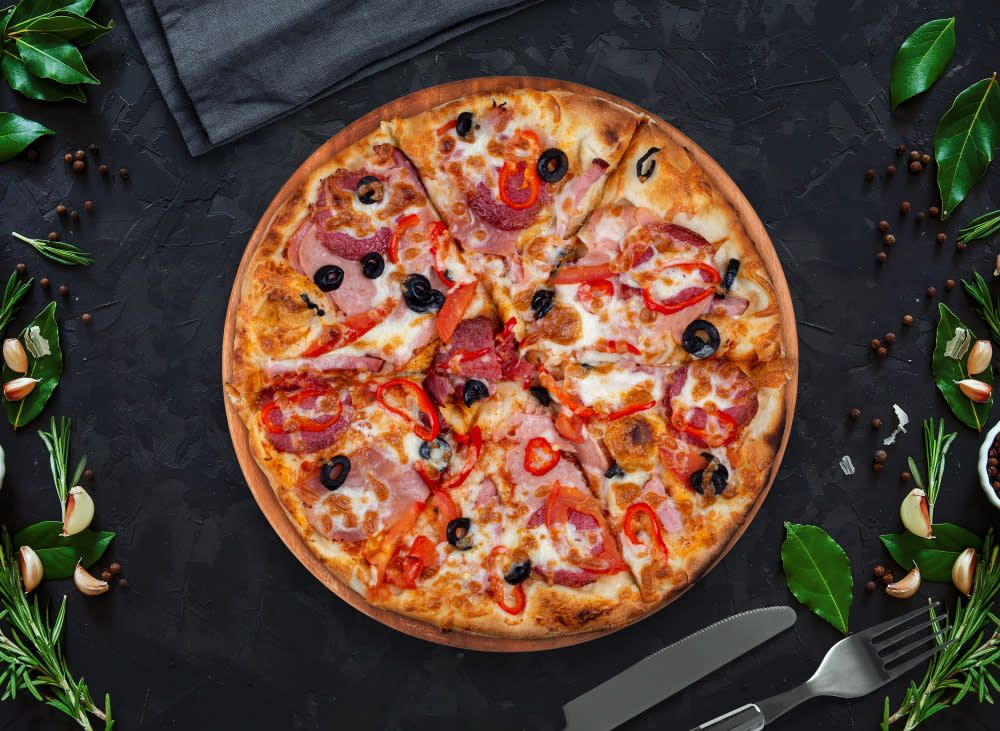 Rosii, mozzarella, cascaval, parmezan, anchois, ton, capere, masline, busuioc, ulei de masline, usturoi, 2 chifle