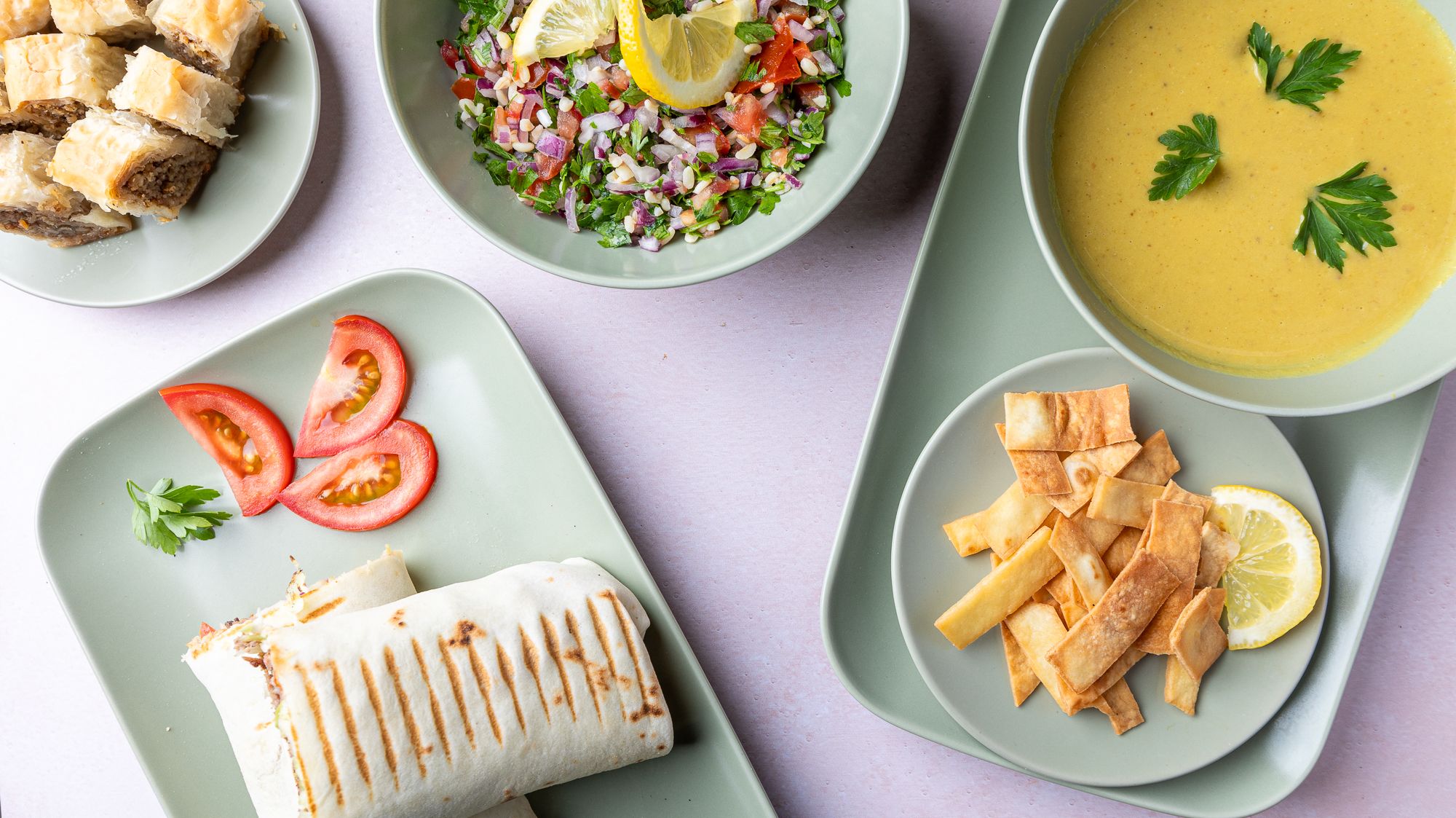 5 falafela, humus, tahini, tortilja, salate vi birate