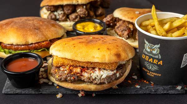 Srednja pljeskavica Ušara od 100% junećeg mesa iz domaćeg uzgoja pečena na eko grilu sa pohovanim kačkavaljem