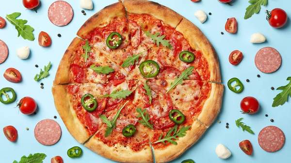 Paradajz sos, origano, šunka, kačkavalj, šampinjoni, suvi vrat, paprika, jaje