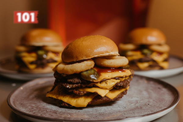 5x 100% juneće meso, sveža zemička, 5x topljeni cheddar, ajsberg, onion rings, BBQ sos, jalapeno papričice