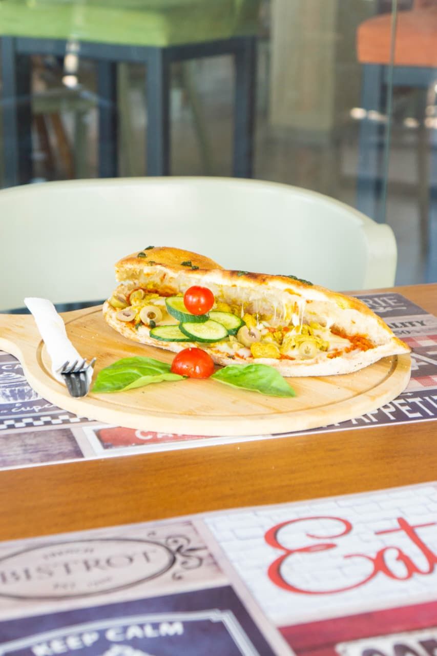 Sauce tomate, légumes sautés ou salade méchouia , mozzarella, gruyère , escalope, sauce pesto