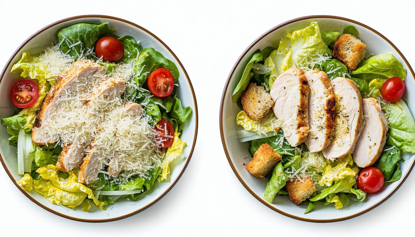 Laitue, tomate cerise, mozzarella, maïs, escalope, œuf, croûtons de pain, sauce césar.
