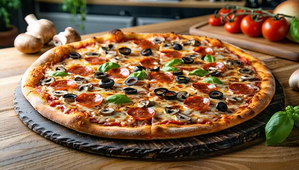Pâte galette, sauce tomate, mozzarella, thon, jambon, olives