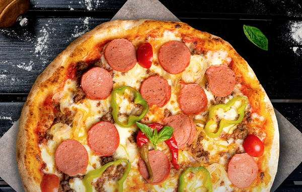Sauce tomate parfumée d'huile d'olive, mozzarella, viande haché, pepperoni, oignons caramélisés, piment sauté, basilic frais, tomates cerises, filet d'huile d'olive