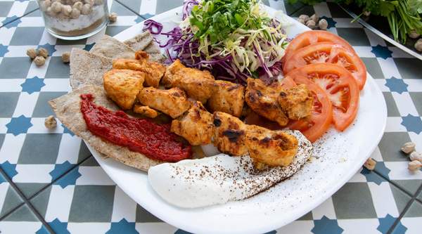 Servi avec harissa, mayonnaise, 3 salades, frites