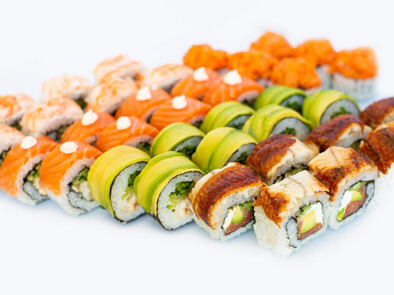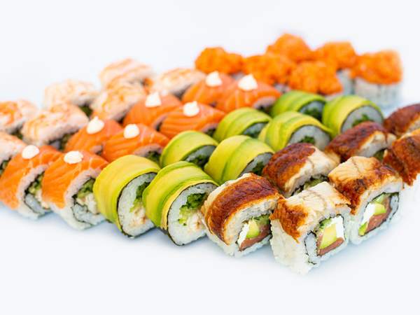 Рис, норі, сир, авокадо, лосось.