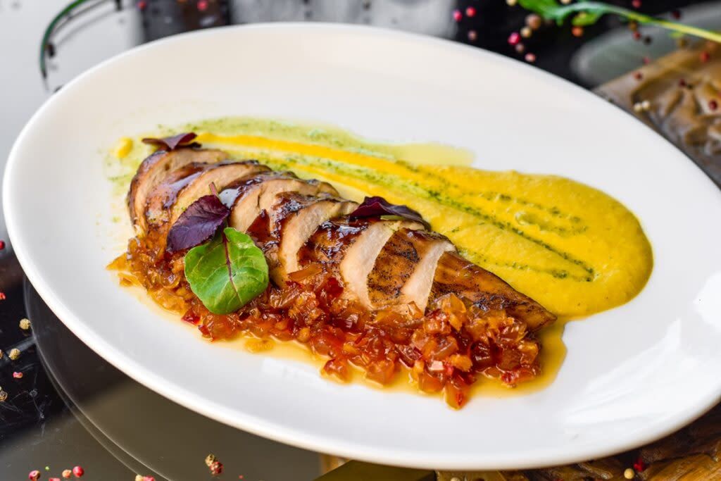 Качине філе, картопляний гратен, вишневий соус, зелена олія