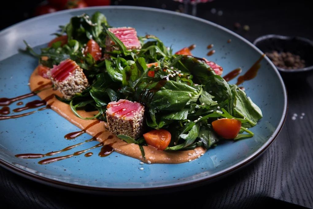 Салат із тунцем в кунжуті та горіховим соусом (200g)