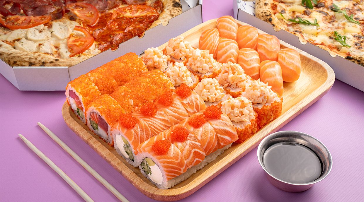 1035 г. 32 шт. З цим сетом безкоштовно 1 васабі, 1 імбир, 2 соєвих соуса.-рол Філадельфія з лососем і тунцем (8 шт.);-рол з лососем та такуаном (8 шт.);-рол з креветкою, ананасом та масаго (8 шт.);-запечений рол з тамаго і грушею (8 шт.).