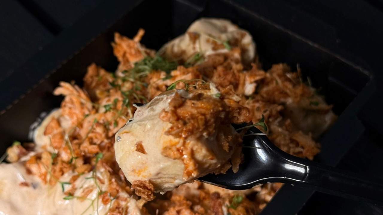 Галушки з індичкою, цибулевими кріспами в вершково-деміглясовому соусі
