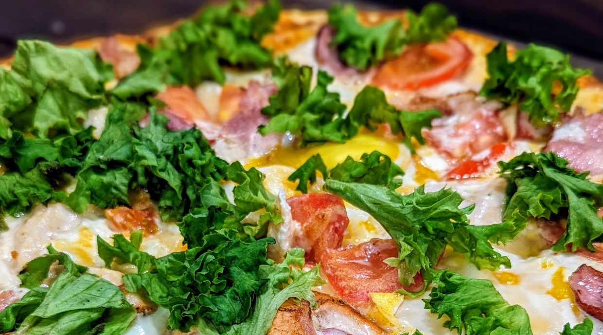 Американська піца 12" Cezar: мікс сирів, французький соус, яйце, помідори, листя салату, бекон, куряче філе. Вага: 1150 г. Тонке або пухке тісто. Соковите поєднання сирів, курячого філе та овочів, нагадує класичний салат Цезар.