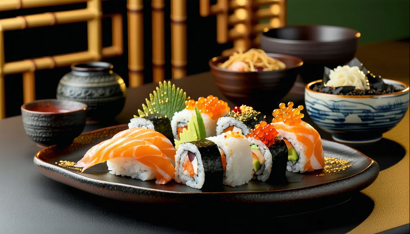 Норі, рис, Крем-Сир, вугор, лосось, авокадо, чорнила Каракатиці, Унагі соус, мигдальні пластівці