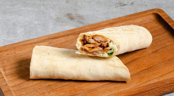 հավի միս, լոլիկ, թթու վարունգ, սխտորի սոուս, կարմիր սոուս, սոխ, կանաչի, լավաշ, կծու բիբար