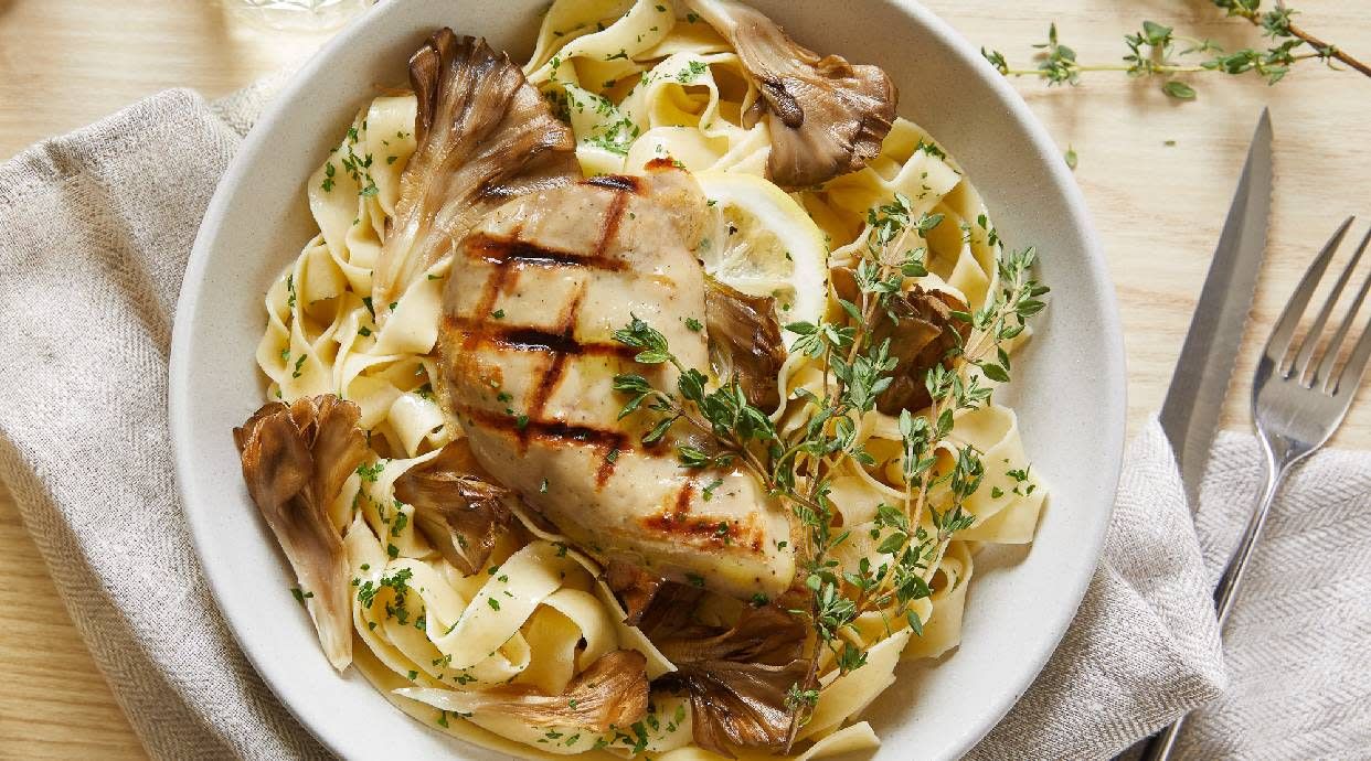 Пилешко филе, гъби, топено сирене, сметанов сос, хрупкави картофки