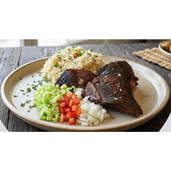 1 gros poisson thon frit avec de l'attiéké & tomate & aromate & l'eau & sucrerie au choix