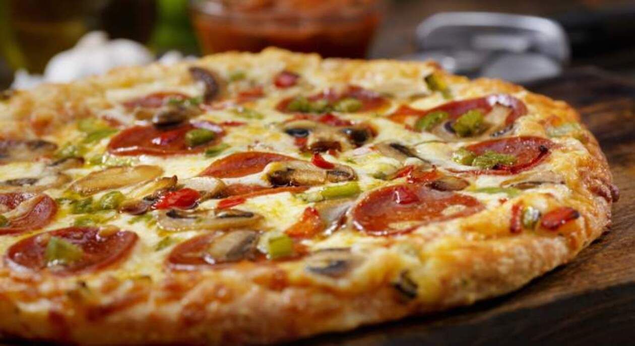 Salsa de tomate, queso, champiñones, jamón, pavo, carne, olivas