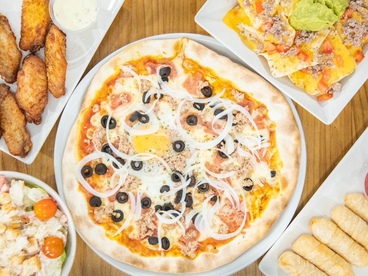 Base nata, mozzarella, pollo, carne picada, bacon, cebolla y salsa barbacoa