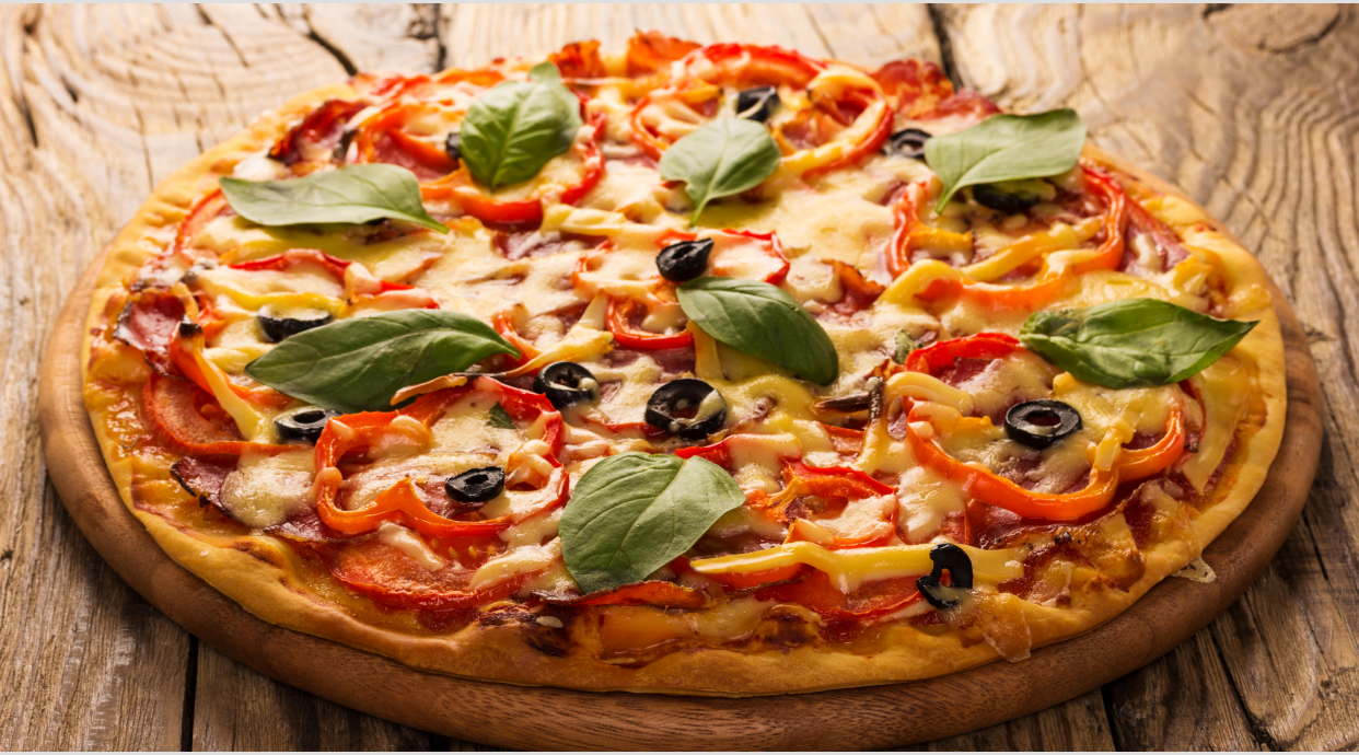 Salsa de tomate, queso mozzarella, cebolla , aceituna rodajas, pimientos asados, champiñones y orégano