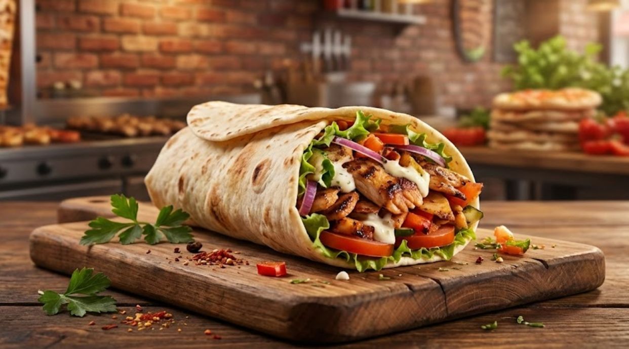 Pan fino enrollado, carne de ternera o pollo, queso, ensalada y salsas