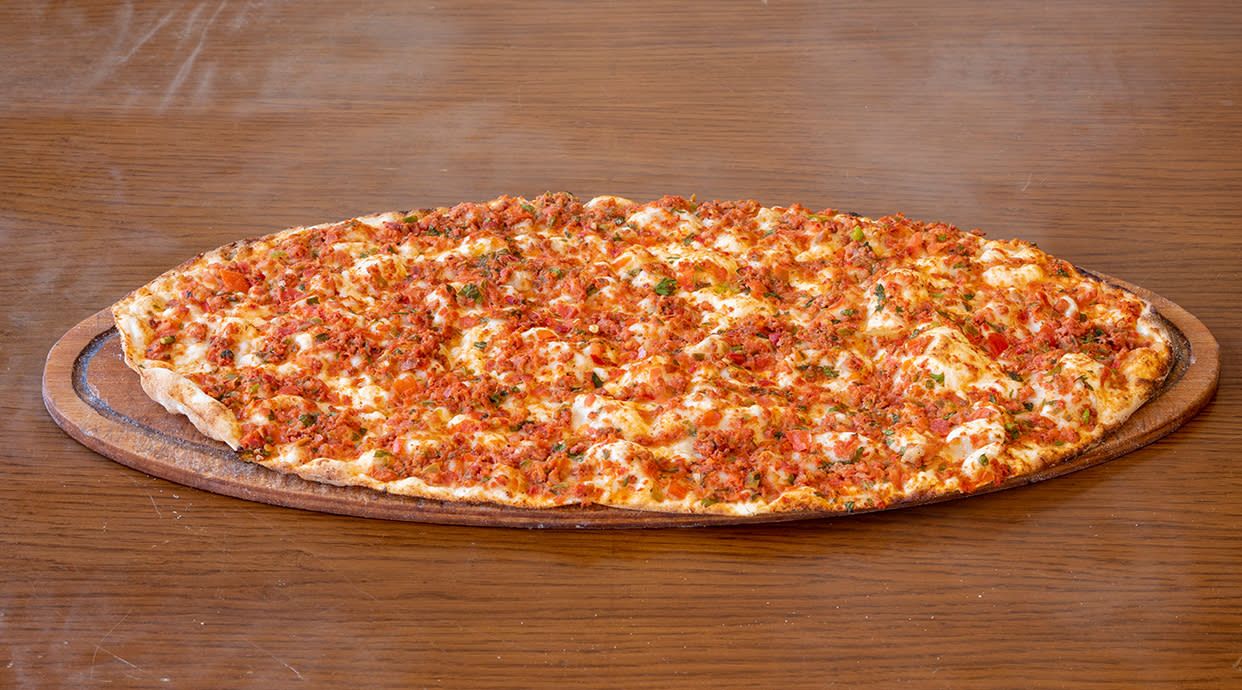 Pizza turca, carne mixta (ternera y pollo), queso, ensalada (lechuga, tomate y cebolla) y salsas (yogurt y picante)