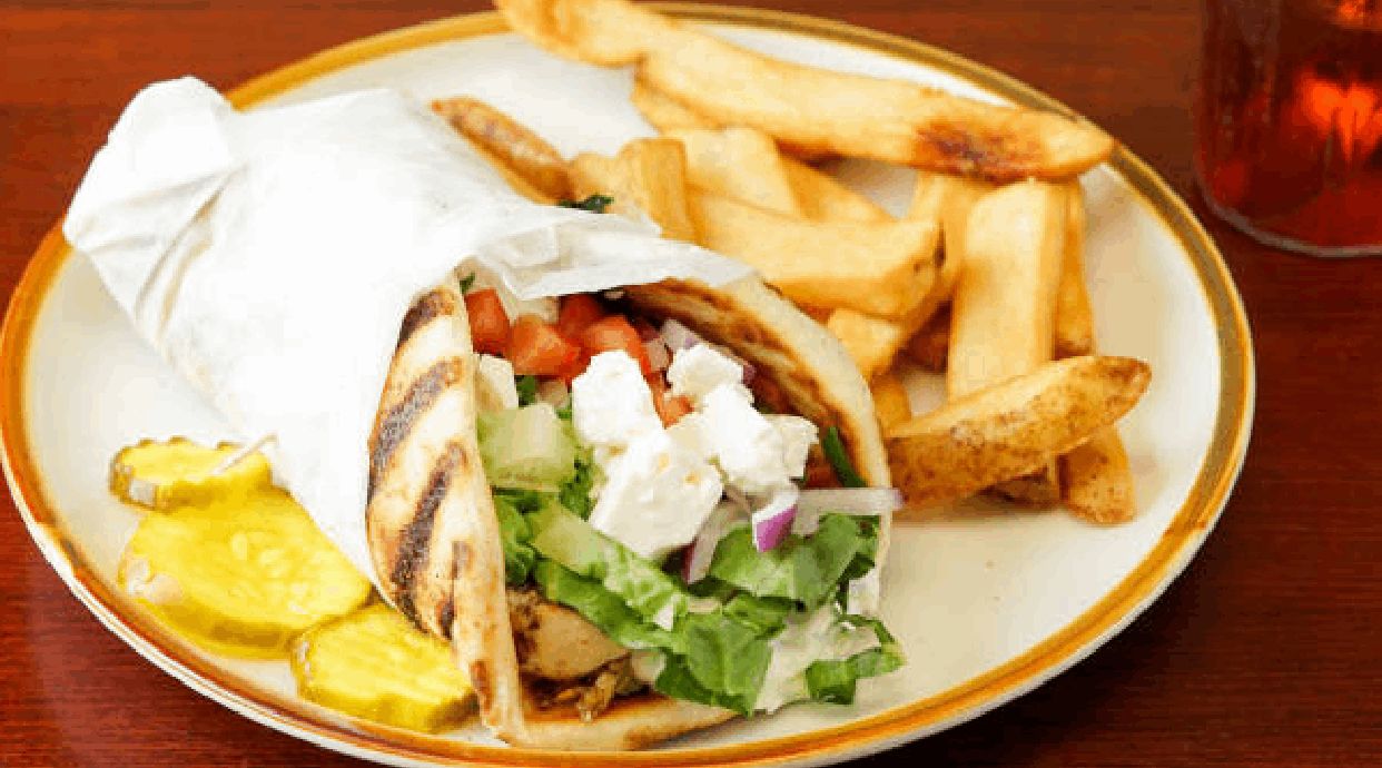 Pan enrollado, pollo, ternera o mixto, ensalada y salsas