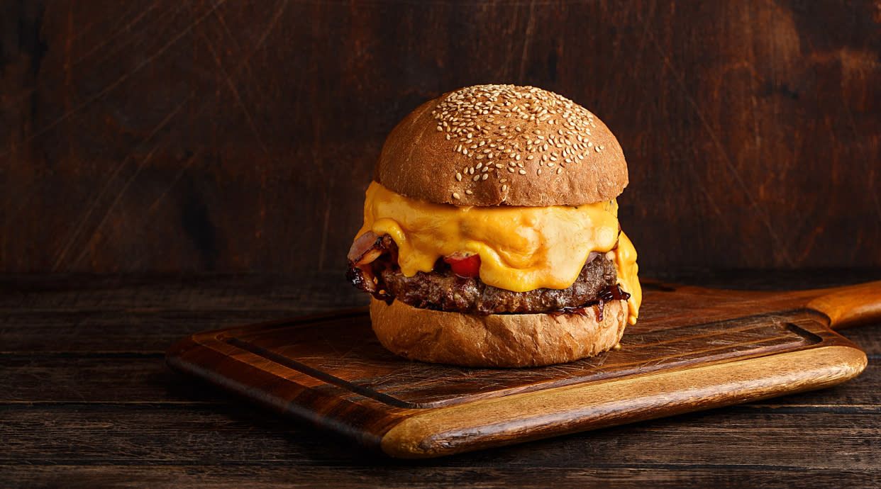 Hecho con doble carne, queso cheddar, York, lechuga, tomate y cebolla
