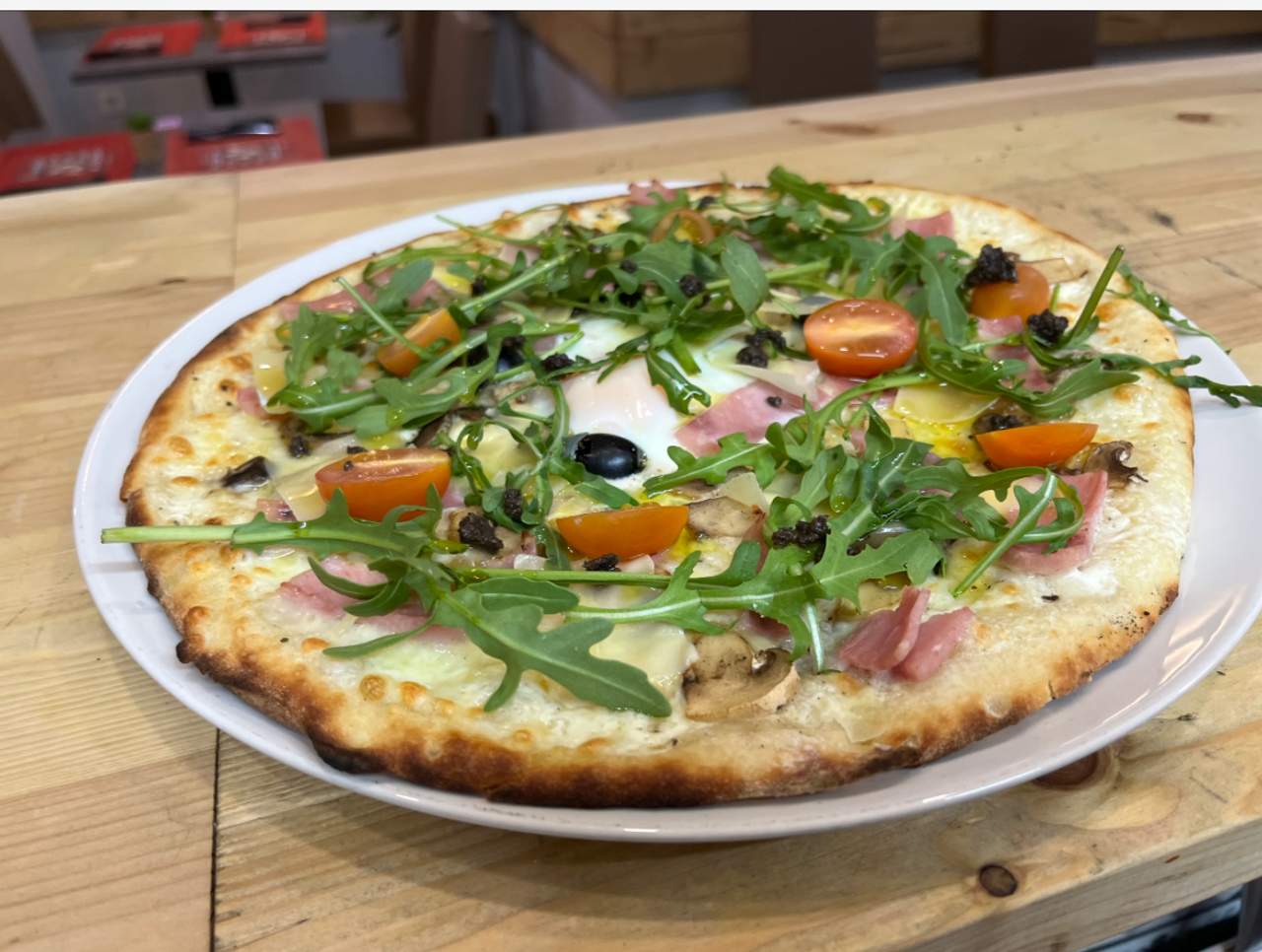 Nata, aceite de trufa, tomates cherry, rúcula, setas, jamón dulce, parmesano, brisada de trufa, huevo, mozzarella