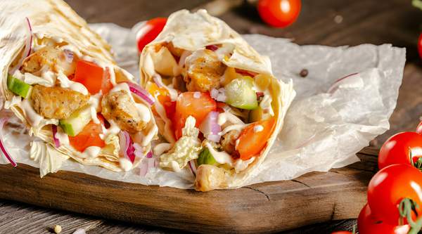 Tortilla rellena de pollo, lechuga, queso, cebolla, tomate y salsa blanca