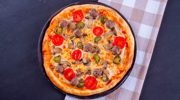 Tomate, queso, jamón dulce, bacon, cebolla, champiñones, alcachofa, maíz, pepperoni y olivas.